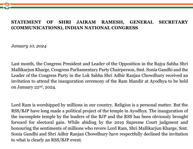 ജനുവരി 22നു നടക്കുന്ന പരിപാടിയിലേക്ക് ശ്രീരാമ തീര്ത്ഥ ട്രസ്റ്റ് ഇവരെ നേരില് സന്ദര്ശിച്ചാണ് ക്ഷണിച്ചത്. കോണ്ഗ്രസ് ജനറല് സെക്രട്ടറിയാണ് നേതാക്കള് പങ്കെടുക്കില്ലെന്ന് അറിയിച്ച് പ്രസ്താവനയിറക്കിയത്. ചടങ്ങിനെ ബിജെപിയും ആര്എസ്എസും രാഷ്ട്രീയവല്ക്കരിക്കുന്നുവെന്നും നിര്മ്മാണം പൂര്ത്തിയാക്കാത്ത ക്ഷേത്രത്തിലെ ചടങ്ങ് ലോക്സഭാ തിരഞ്ഞെടുപ്പു ലക്ഷ്യമിട്ടെന്നും വിലയിരുത്തിയാണ് വിട്ടുനില്ക്കാനുള്ള കോണ്ഗ്രസിന്റെ തീരുമാനം.