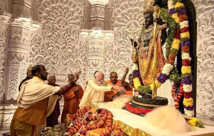 അയോധ്യയിൽ രാമലല്ലയുടെ വിഗ്രഹം സ്ഥാപിച്ചുകൊണ്ട് രാമക്ഷേത്രം രാജ്യത്തിനായി സമർപ്പിച്ചു. ആചാരപരമായ ചടങ്ങുകൾക്ക് പ്രധാനമന്ത്രി മോദി നേതൃത്വം നൽകി. ആർഎസ്എസ് മേധാവി മോഹൻ ഭഗവന്തും, യോഗി ആദിത്യനാഥും ചടങ്ങിൽ പങ്കെടുത്തു. പ്രധാനമന്ത്രി നരേന്ദ്ര മോദിയുടെ നേതൃത്വത്തില് ക്ഷേത്രത്തിന്റെ ഗർഭഗൃഹത്തിലാണ് രാംലല്ല വിഗ്രഹ പ്രതിഷ്ഠ നടന്നത്. പ്രാണ പ്രതിഷ്ഠ നടക്കുമ്പോള് ക്ഷേത്രത്തിന് പുറത്ത് സൈനിക ഹെലികോപ്ടറില് പുഷ്പവൃഷ്ടി നടത്തി. ഉച്ചയ്ക്ക് 12.20നും 12.30നും ഇടയിലുള്ള 84 സെക്കൻഡ് ശുഭമുഹൂര്ത്തത്തിലാണ് പ്രാണ പ്രതിഷ്ഠ നടന്നത്. പ്രതിഷ്ഠ ചടങ്ങിൽ മുഖ്യ മുഖ്യ യജമാനനായിട്ടാണ് പ്രധാനമന്ത്രി പങ്കെടുത്തത്. കാശിയിലെ ഗണേശ്വർ ശാസ്ത്രി ദ്രാവിഡിന്റെ മേൽനോട്ടത്തിൽ പണ്ഡിറ്റ് ലഷ്മീകാന്ത് ദീക്ഷിതാണ് പൂജകൾക്ക് മുഖ്യകാർമ്മികത്വം വഹിച്ചത്.