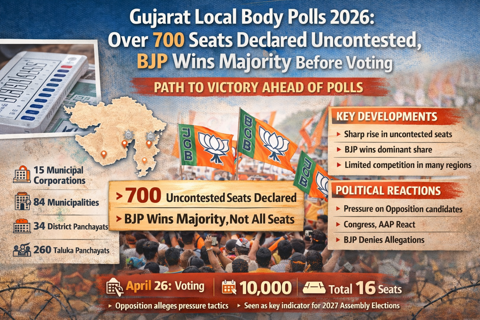 Gandhinagar: Ahead of the Gujarat local body elections scheduled for April 26, 2026, a significant number of seats have already been decided without polling, with the Bharatiya Janata Party (BJP) emerging as the main beneficiary.