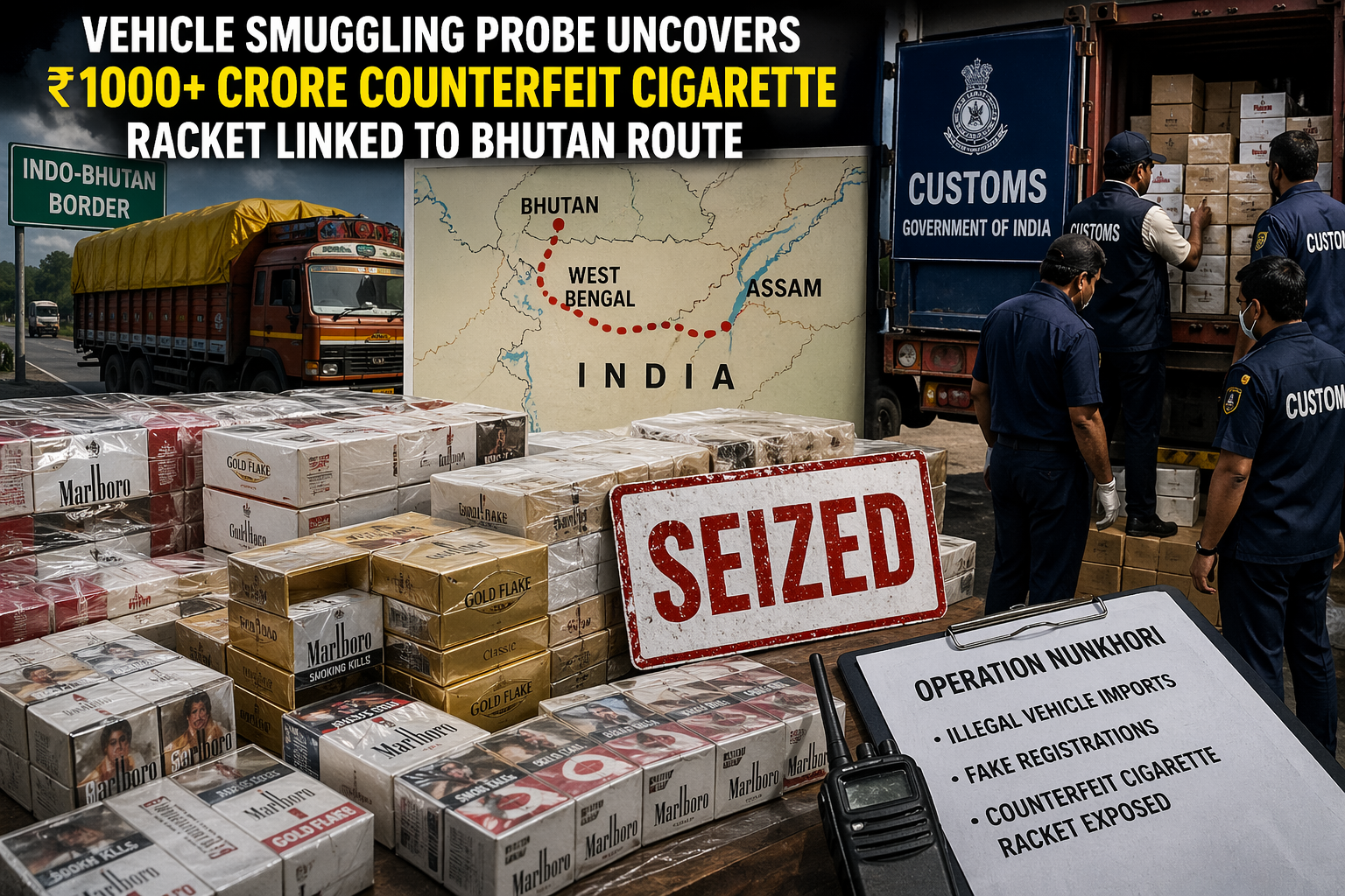 A large counterfeit cigarette smuggling network linked to Bhutan has been uncovered, with an estimated value exceeding ₹1000 crore. The investigation, which began with a ₹4 crore seizure, has revealed strong links to illegal vehicle smuggling operations. Authorities are now intensifying coordinated enforcement efforts to curb the network.