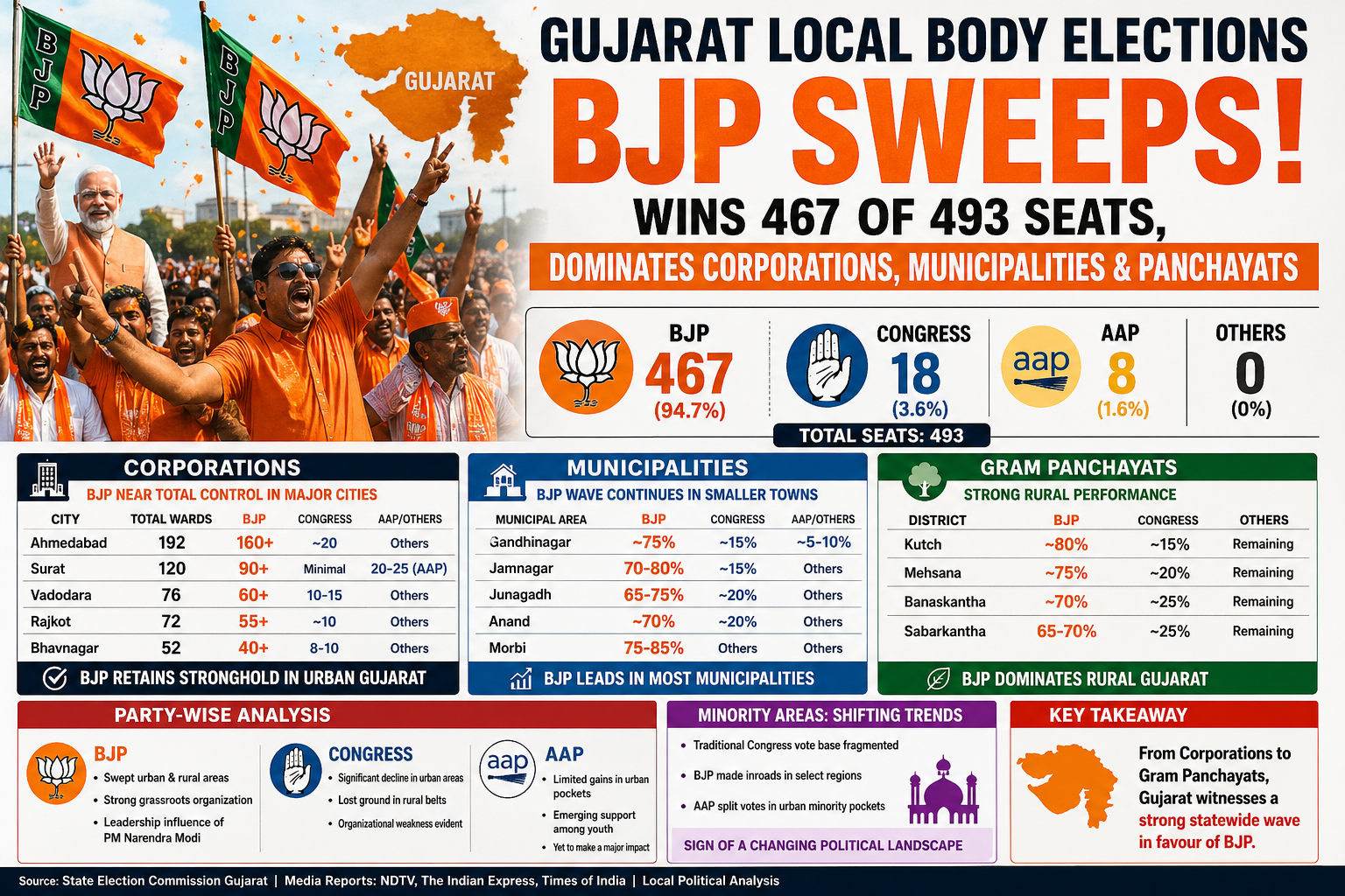 Overall, the elections underline a clear and consistent trend: a strong statewide mandate in favor of the BJP across Gujarat.