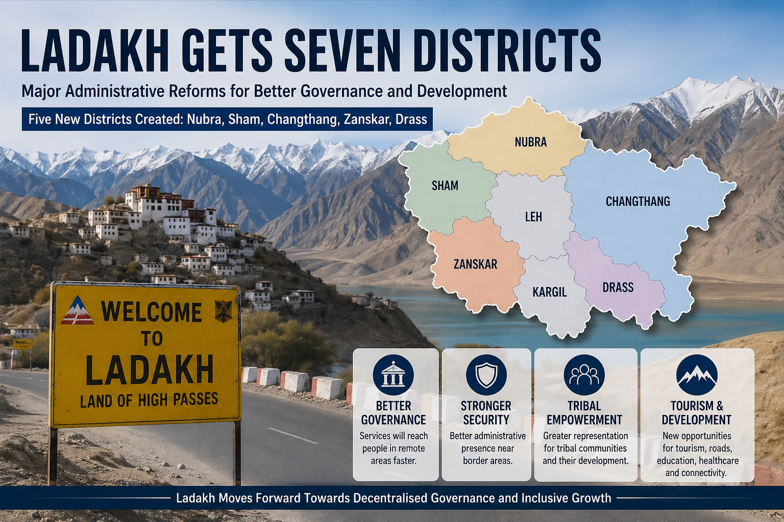 Ladakh became a separate Union Territory in 2019 following the reorganisation of Jammu and Kashmir. Since then, demands for greater autonomy, tribal safeguards, and better administrative decentralisation have increased. The creation of new districts is seen as a partial response to these long-standing demands.